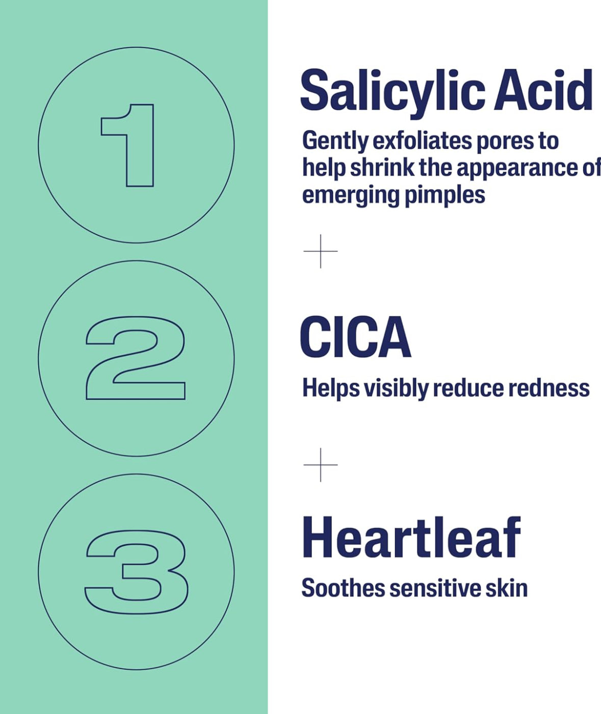 - TARGETS EARLY-STAGE PIMPLES: Formulated with salicylic acid to exfoliate to help shrink the appearance of pimples, CICA (centella asiatica) to help visibly reduce redness and heartleaf extract to help soothe sensitive skin