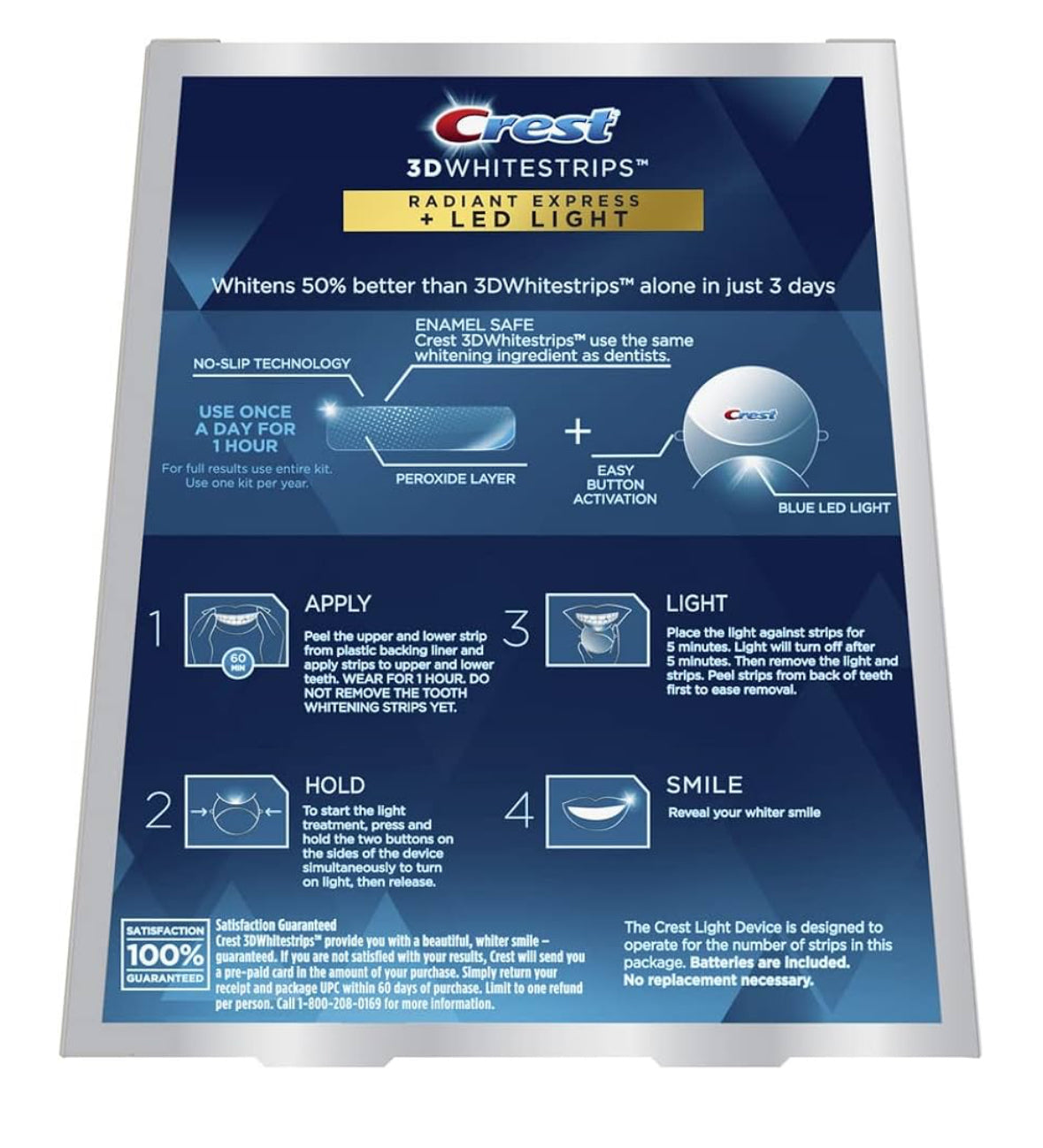 The LED Accelerator Light works to weaken stains so that the whitening ingredients inside Crest 3DWhitestrips can work more effectively to remove stains. In fact, this technology works just like the LED teeth whitening technology dentists use. Plus, the Advanced Seal Technology's comfortable, no-slip grip means the strips stay put until you take them off, allowing you to talk and even drink water while whitening your teeth. Made by the #1 dentist-recommended at-home teeth whitening brand, Crest 3DWhitestrips Radiant Express + LED Light will give you a 100% noticeably whiter smile, guaranteed.