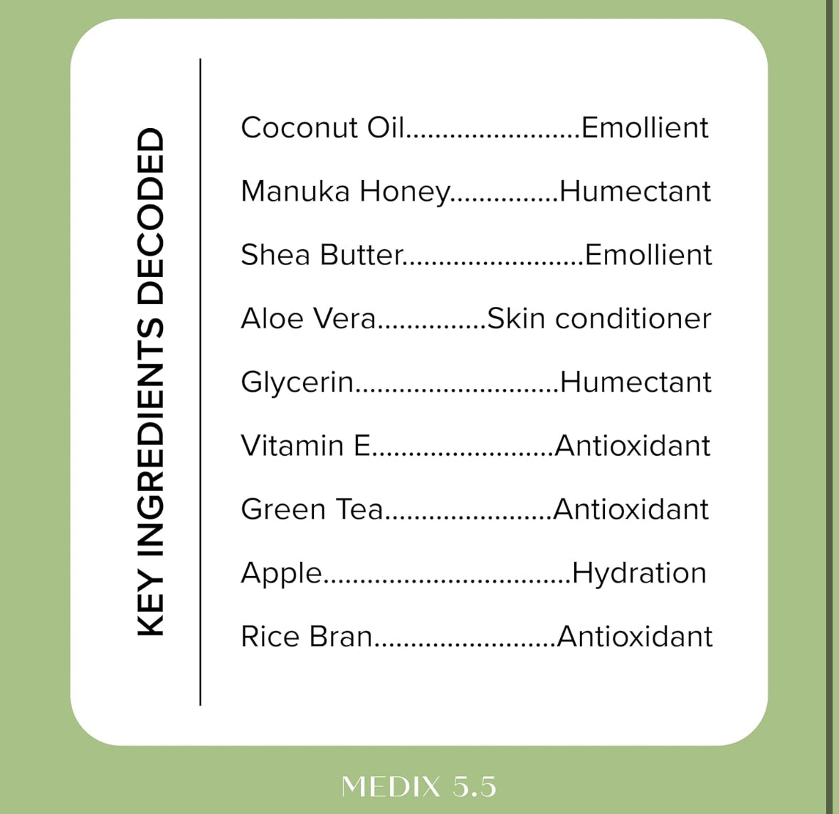 - HYDRATING + TESTED FORMULA – This Medix 5.5 Coconut Oil + Manuka Honey Cream is infused with powerful active ingredients like Coconut Oil, Shea Butter, Manuka Honey, Vitamin E, Aloe Vera, & Fruit Extracts, which all work together to help nourish, hydrate, & replenish skin for a healthier, fuller, & younger appearance. Compatible with all skin types. Dermatologist-Tested & Clinically-Tested Formula that is lightweight and formulated to easily absorb leaving your skin supple and smooth.