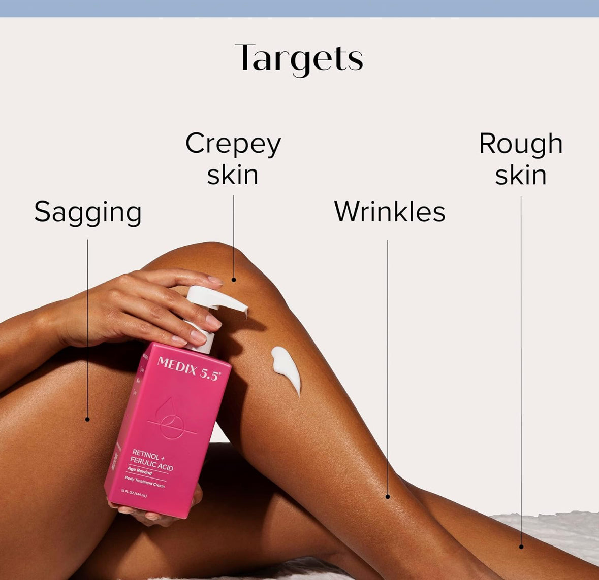 - RETINOL CREAM – Vitamin A (Retinol) is considered to be the #1 Dermatologist recommended anti aging skin care ingredient. It is known to diminish the look of deep wrinkles, sagging skin, fine lines, crepey skin, & sun damage while boosting collagen production to help with firming. Medix 5.5 Retinol Body Lotion Age Rewind Moisturizer Cream is the perfect combination of anti aging ingredients with natural-antioxidants to help you promote more radiant skin and a more youthful look.