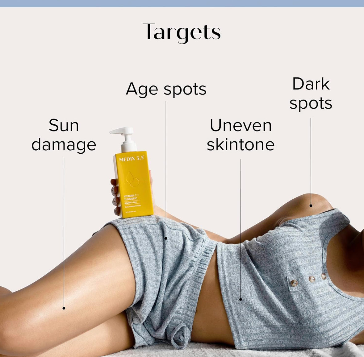- EFFECTIVE INGREDIENTS – Medix 5.5 Vitamin C Cream Brighten + Firm Body Lotion is formulated with the perfect combination of effective anti aging + brightening ingredients, including Shea Butter, Aloe Vera, Ferulic Acid, Turmeric, Vitamin E, Glycerin, Ginger, & More. Shea Butter deeply moisturizes the skin, improves elasticity, & provides a protective barrier to help prevent moisture loss. Vitamin E helps protect skin against free radicals + UV Damage. Aloe Vera helps calm + hydrate the skin.