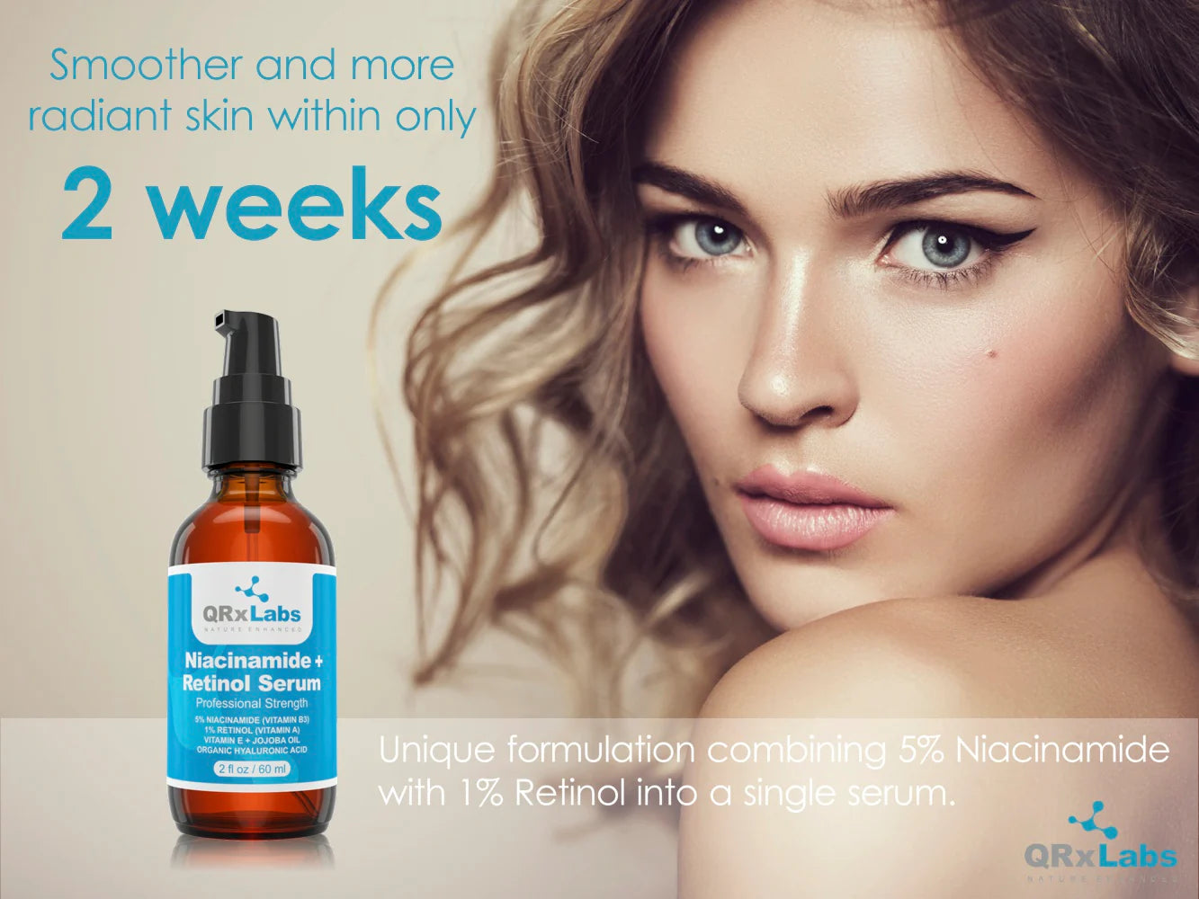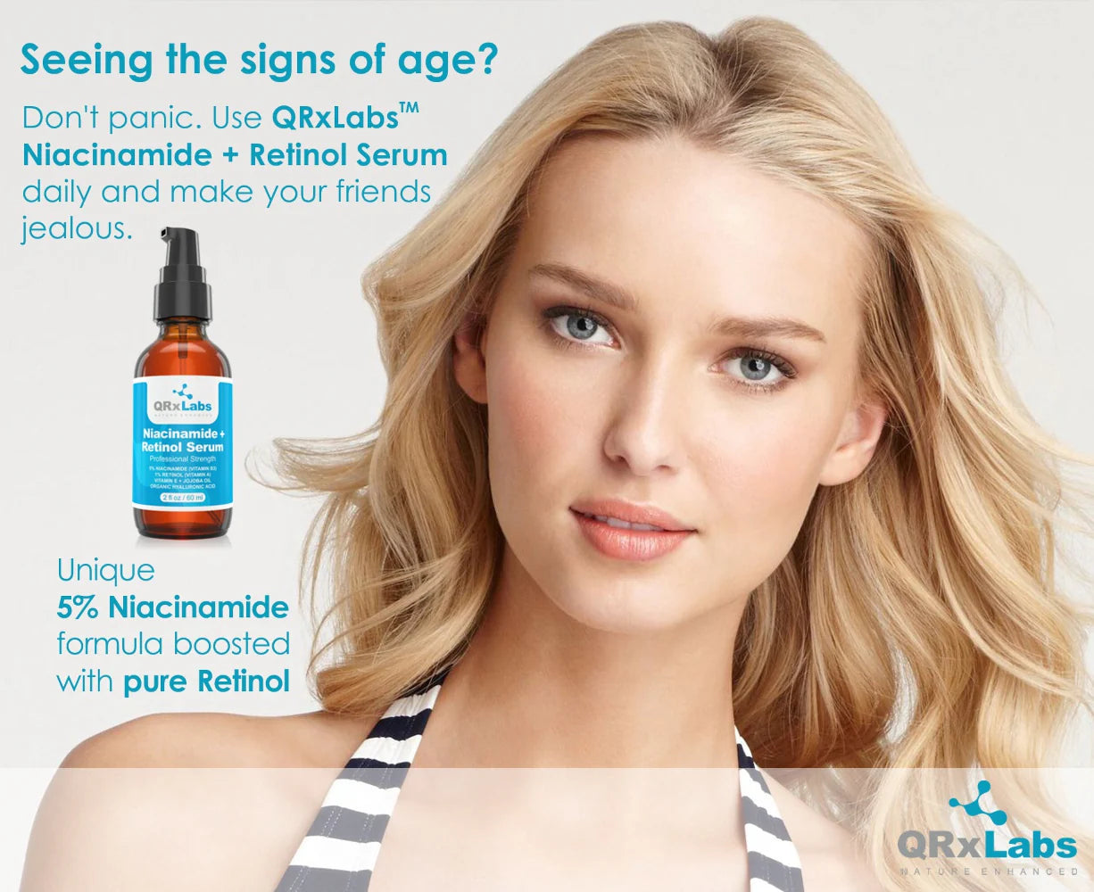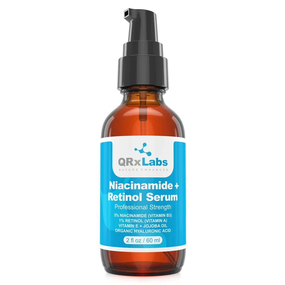 The QRxLabs Niacinamide + Retinol Serum may be the solution you have been wishing for. It is an advanced anti-aging serum that combines Niacinamide (which is a form of Vitamin B3) and Retinol, two proven ingredients, with Organic Aloe Vera, Vitamin E, Jojoba Oil, Hyaluronic Acid and a cocktail of natural extracts, resulting in a thick, rich, highly potent serum that will blow you away.